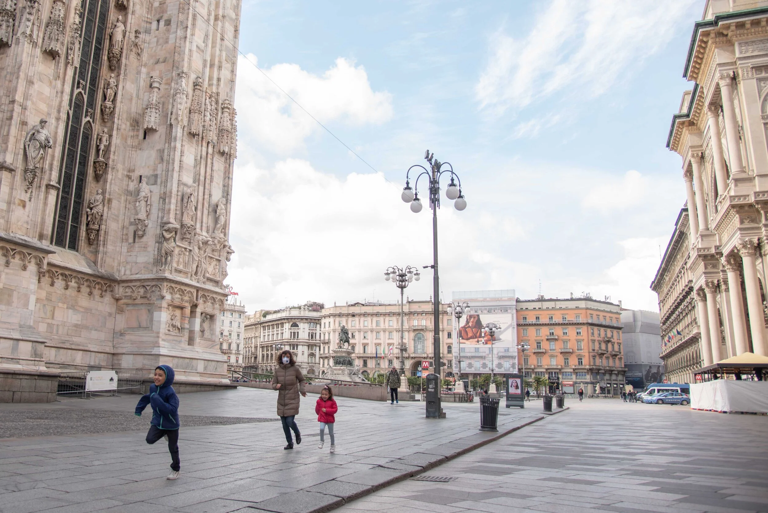 Piazza Duomo, Milan - A man quickly crossed the empty square while wearing a face-mask