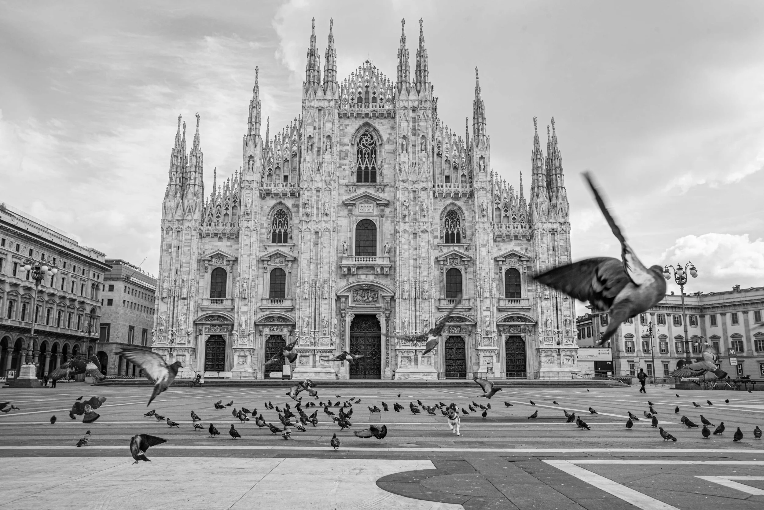 A shot like this would be normally unimaginable. Throughout the year this square is packed with tourist as it boasts the nr. 1 landmark of Milan; il Duomo. Now just a handfull people, police and soldier are to be seen.